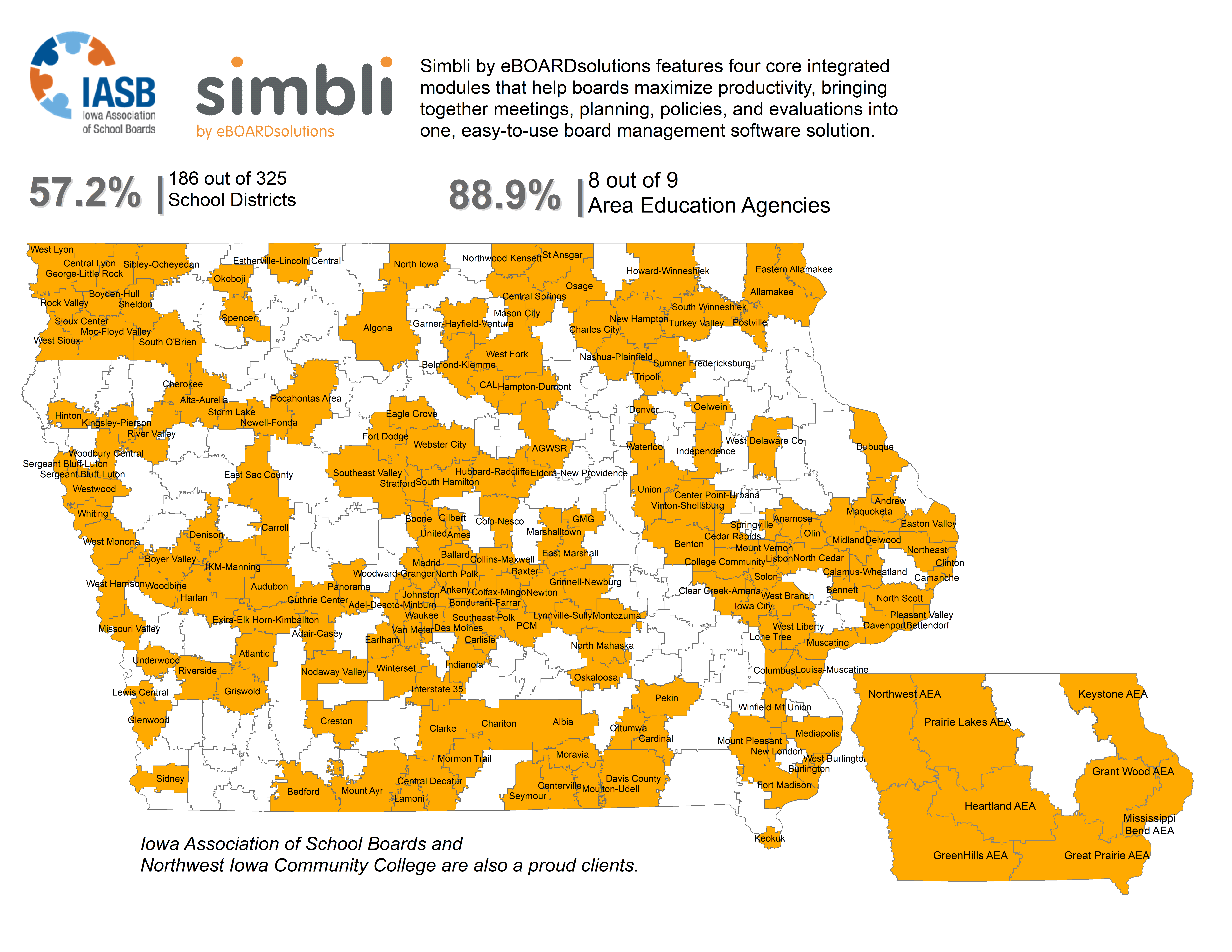 Simbli by eBOARDsolutions logoSimbli by eBOARDsolutions features four core integrated modules that help boards maximize productivity, bringing together meetings, planning, policies, and evaluations into one, easy-to-use board management software solution. Although each module is strong alone, the power to drive more effective board governance and achieve organizational excellence lies in their ability to work together. And with our iPad app and web browser accessibility, your board and its stakeholders can always get the information they need—anywhere, at any time. Check out this map of current Simbli users across Iowa!